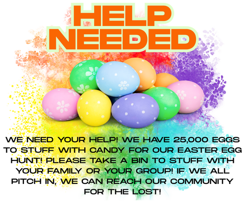 Our annual Easter Egg Hunt is coming up on April 20th following the 10:30 service. This is a large event and we need your help to make it happen. Would you consider helping in one of these positions? Click the VOLUNTEER link below to join our Easter Dream Team. Thank you!!