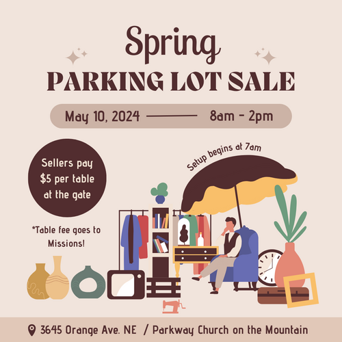 Our Spring Parking Lot Sale is this Saturday from 8am - 2pm. This will be in the parking lot of Parkway Church on the Mountain. You can come support by shopping, selling or both. Sellers pay $5 table fee per table (goes towards Missions)