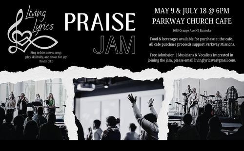 Join us at Parkway Church Cafe for a relaxed, Spirit-filled evening of praise THIS FRIDAY @ 6pm. Food and beverages will be available for purchase at the Parkway Church Cafe, with all proceeds supporting Parkway Missions!