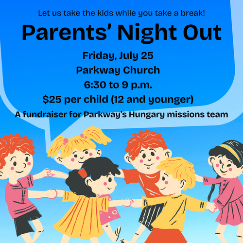 Parents, enjoy a night out to yourselves! Drop the kids off at Parkway Church for Parents' Night Out on Friday, July 25 from 6:30 p.m. - 9 p.m.